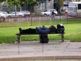 On the other side of the memorial's pool I see a homeless man relaxing and enjoying a cigarette.