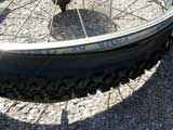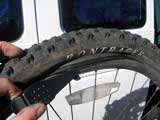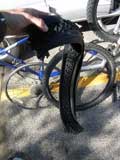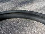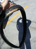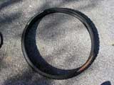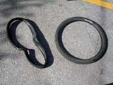 I try to reshape the new tire as best as I can and throw it on the ground next to the old tire. Looking at the new tire, it certainly doesn't look like it's going to work, it's just too messed up.