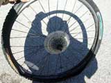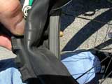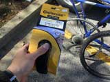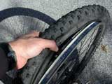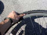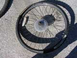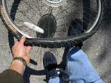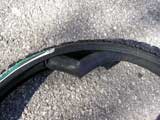 Off with the old tire. After deflating the tube, I use a special tool to pry the tire off the rim.