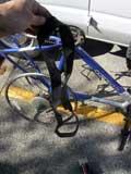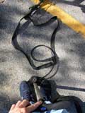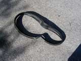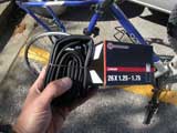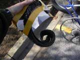 The replacement tire is all folded up. I release it from its cardboard bondage. It kinda looks like a limp snake.