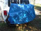 I throw the bikes back on the rack, then cover them up with the tarp. Too bad the tarp doesn't keep out all of the moisture. Oh well, I do the best I can. The black clips help somewhat to keep things buttoned down.
