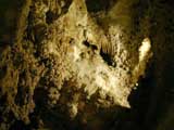 Hanging speleothems or "draperies" result when water flows down gently-arched ceilings. As in the creation of all speleothems, curious formations result when flowing water deposits traces of calcite over vast periods of time.