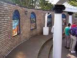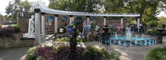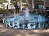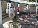Before this ground was turned into a cemetery, it was Elvis' place of contemplation and meditation. Currently, it features a circular 12-foot fountain pool containing one large water jet encircled by 5 smaller ones that are all lit by multi-colored lights. The curving wall in front of the grave markers is made of Mexican brick and holds 4 stained-glass windows.